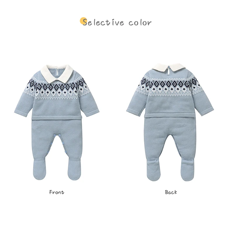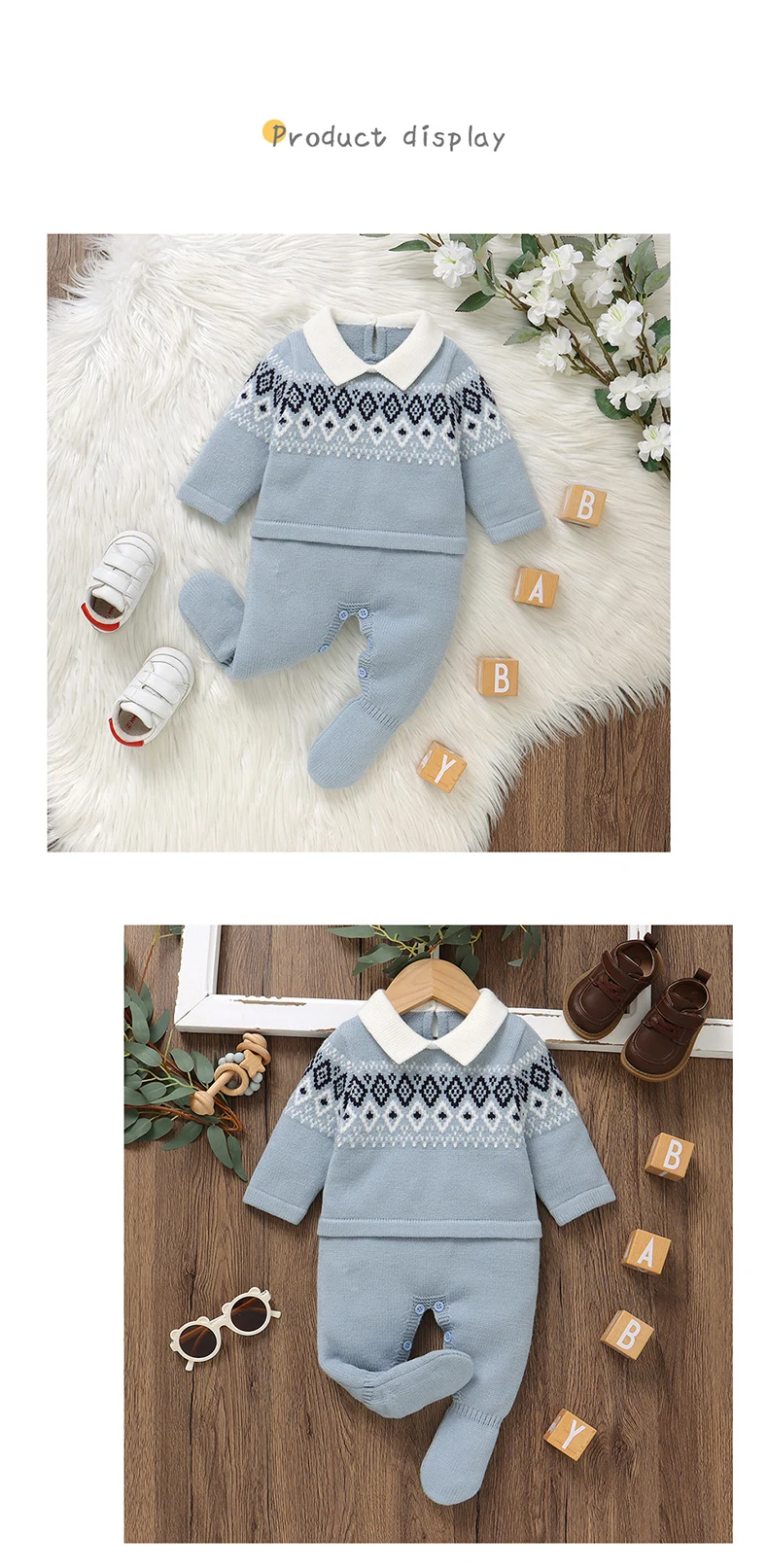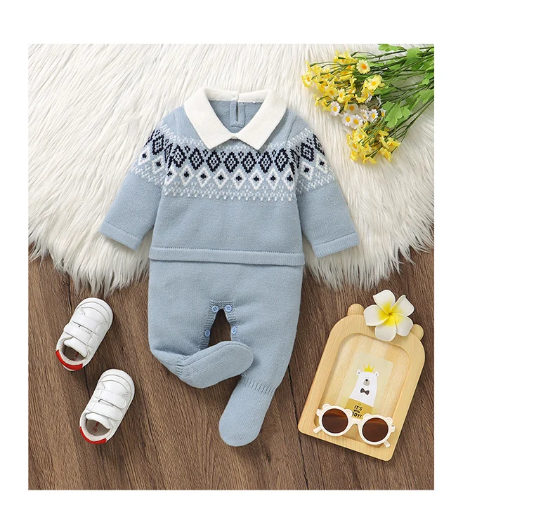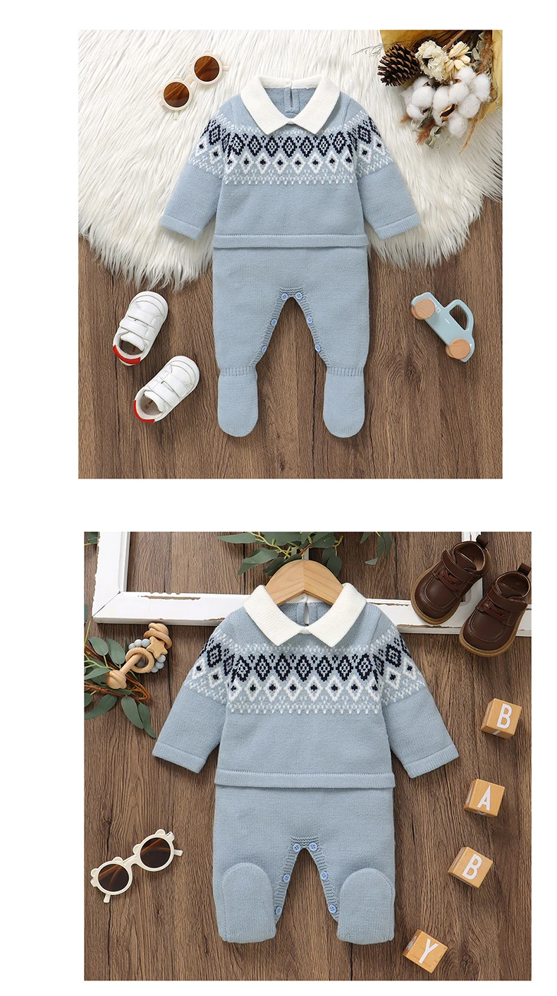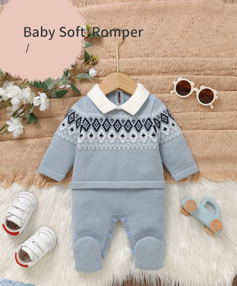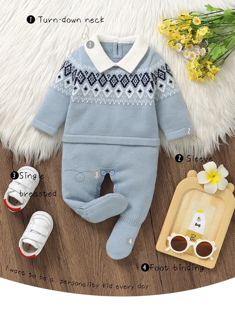Baby Rompers Fashion Geometry Newborn Boys Jumpsuit Knitted Infant Kid Clothing 0-9M Turn-down Long Sleeve Foot Wrap Autumn Warm